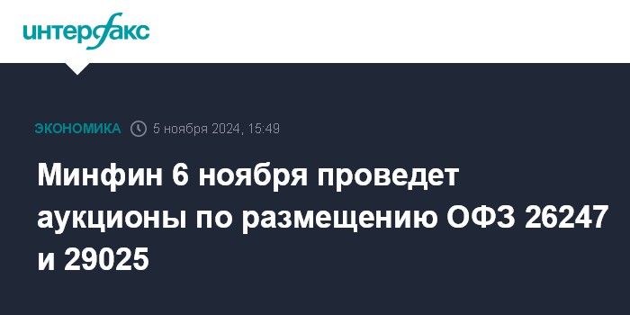 Минфин 6 ноября проведет аукционы по размещению ОФЗ 26247 и 29025