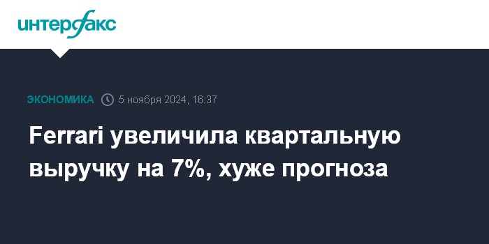 Ferrari увеличила квартальную выручку на 7%, хуже прогноза