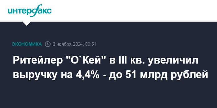 Москва. 6 ноября. INTERFAX.RU - Ритейлер "О`Кей" (O`Key Group) в III квартале 2024 года получил чистую розничную выручку в 51 млрд рублей, что на 4,4% превышает показатель аналогичного периода 2023 года, сообщила компания.