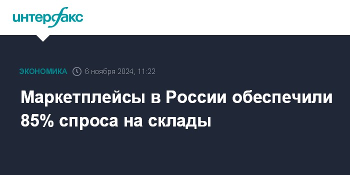 Москва. 6 ноября. INTERFAX.RU - Доля маркетплейсов в общей структуре спроса на складскую недвижимость составила 85%, рассказал на выставке MALLPIC генеральный директор CORE.XP Владимир Пинаев.