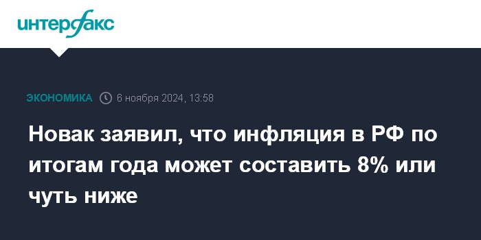 Москва. 6 ноября. INTERFAX.RU - Инфляция в России в 2024 году ожидается на уровне 8% или немного ниже, заявил вице-премьер РФ Александр Новак журналистам на полях 21-го заседания международного дискуссионного клуба "Валдай".