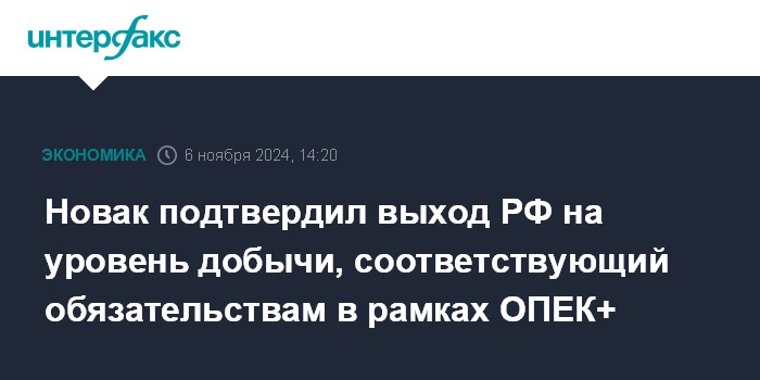 Новак подтвердил выход РФ на уровень добычи, соответствующий обязательствам в рамках ОПЕК+