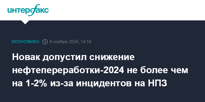 Новак допустил снижение нефтепереработки-2024 не более чем на 1-2% из-за инцидентов на НПЗ