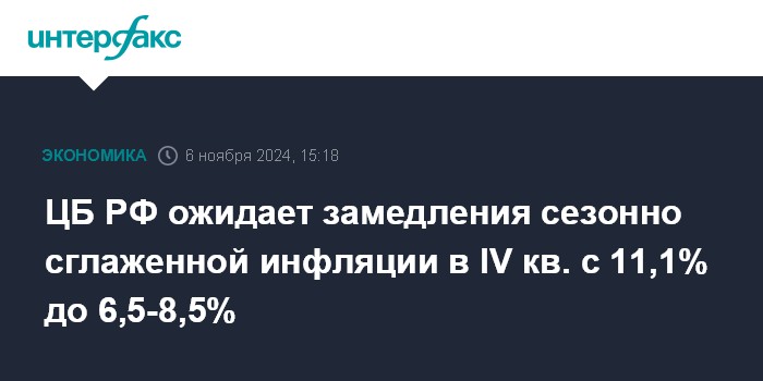 Москва. 6 ноября. INTERFAX.RU - Банк России ожидает замедления сезонно сглаженной инфляции в годовом выражении в IV квартале 2024 года до 6,5-8,5% с 11,1% в III квартале, 8,7% во II квартале и 5,9% в I квартале текущего года, говорится в комментарии ЦБ к среднесрочному макроэкономическому обзору.