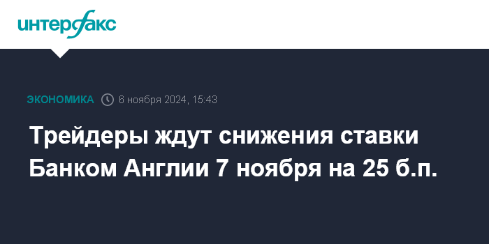 Москва. 6 ноября. INTERFAX.RU - Трейдеры ждут снижения базовой процентной ставки Банком Англии в ноябре на 25 базисных пунктов (б.п.), несмотря на бюджетное стимулирование.