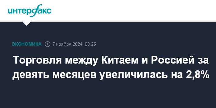 Москва. 7 ноября. INTERFAX.RU - Рост китайско-российской торговли за первые девять месяцев 2024 года составил 2,8% в годовом исчислении и достиг $202,211 млрд, сообщило Главное таможенное управление (ГТУ) КНР.