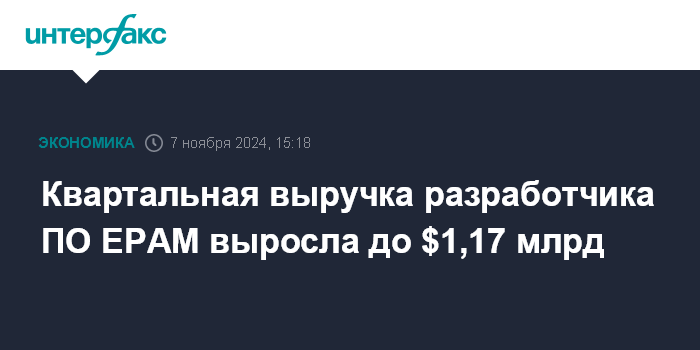 Москва. 7 ноября. INTERFAX.RU - В третьем квартале 2024 года выручка разработчика ПО EPAM Systems Inc. составила $1,17 млрд, что на 1,3% больше, чем годом ранее, сообщила компания. Выручка в органическом выражении и без учета эффекта от ухода из России снизилась на 0,3% в годовом выражении.