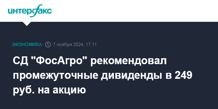 Москва. 7 ноября. INTERFAX.RU - Совет директоров "ФосАгро", обсудив финансовые результаты за 9 месяцев, рекомендовал выплатить промежуточные дивиденды в размере 249 рублей на акцию, сообщила компания.