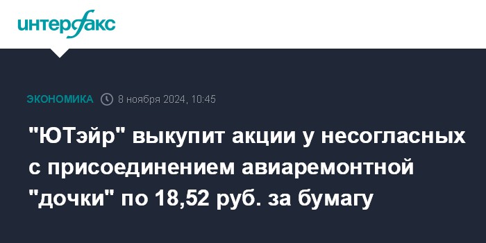 "ЮТэйр" выкупит акции у несогласных с присоединением авиаремонтной "дочки" по 18,52 руб. за бумагу