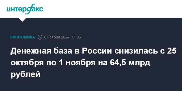 На 25 октября денежная база в России равнялась 18 357,4 млрд рублей. Таким образом, за период она снизилась на 0,36%, или на 64,5 млрд рублей.