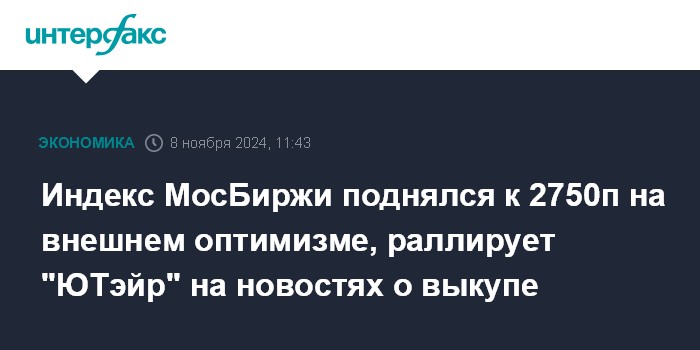 Индекс МосБиржи поднялся к 2750п на внешнем оптимизме, раллирует "ЮТэйр" на новостях о выкупе
