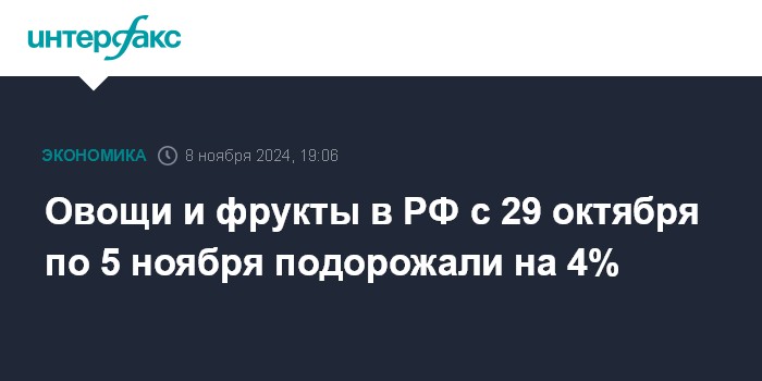 Овощи и фрукты в РФ с 29 октября по 5 ноября подорожали на 4%