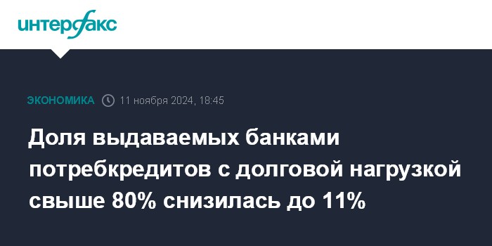 Москва. 11 ноября. INTERFAX.RU - Доля выдаваемых банками потребительских кредитов с показателем долговой нагрузки (ПДН) свыше 80% снизилась в III квартале 2024 года до 11% с 36% в IV квартале 2022 года, с ПДН 50-80% - до 18% c 27% соответственно, говорится в информационно-аналитическом материале Банка России по макропруденциальным лимитам.