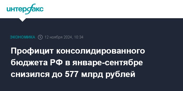Профицит консолидированного бюджета РФ в январе-сентябре снизился до 577 млрд рублей