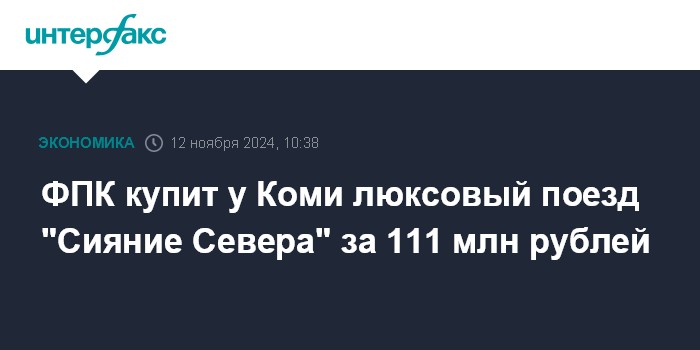 Москва. 12 ноября. INTERFAX.RU - АО "Федеральная пассажирская компания" (ФПК) купит у республики Коми за 110,7 млн рублей туристический поезд "Сияние Севера", сообщает пресс-служба республиканского комитета имущественных и земельных отношений.