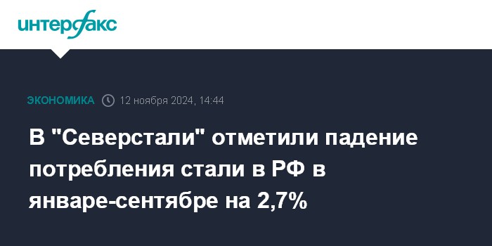 Москва. 12 ноября. INTERFAX.RU - Потребление стали в РФ упало в январе-сентябре 2024 года на 2,7% по сравнению с аналогичным периодом прошлого года, говорится в обзоре, подготовленном аналитиками "Северстали".