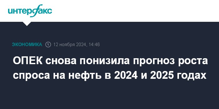 Москва. 12 ноября. INTERFAX.RU - ОПЕК понизила прогноз роста спроса на нефть в 2024 году еще на 110 тысяч баррелей в сутки - теперь до 1,82 млн б/с, то есть, потребление нефти в мире в нынешнем году, как ожидается, составит 104 млн б/с. Коммерческие запасы стран ОЭСР в сентябре снизились на 7,5 млн баррелей.