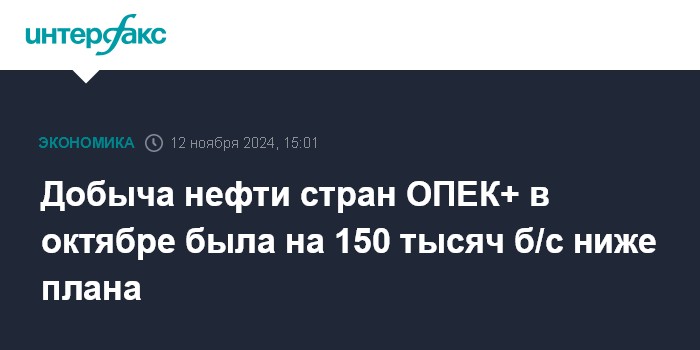 Добыча нефти стран ОПЕК+ в октябре была на 150 тысяч б/с ниже плана