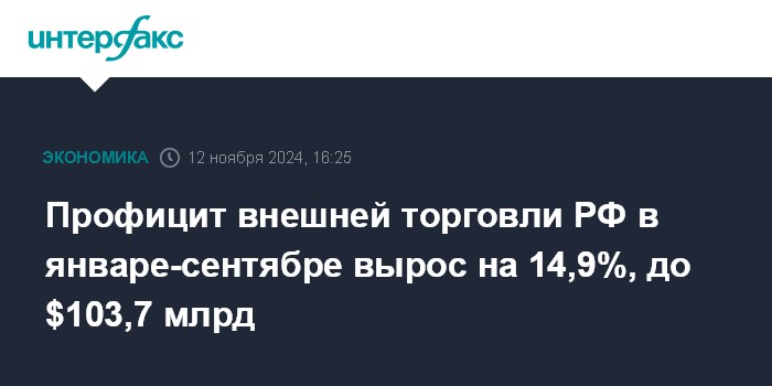 Москва. 12 ноября. INTERFAX.RU - Положительное сальдо внешней торговли РФ, определенное по методологии платежного баланса, в январе-сентябре 2024 года составило $103,7 млрд, что на 14,9% больше, чем за аналогичный период прошлого года, сообщается в информации ЦБ.