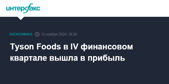 Москва. 12 ноября. INTERFAX.RU - Американский производитель продуктов питания Tyson Foods в четвертом квартале 2024 финансового года вернулcя к прибыли, а его выручка превзошла ожидания аналитиков.