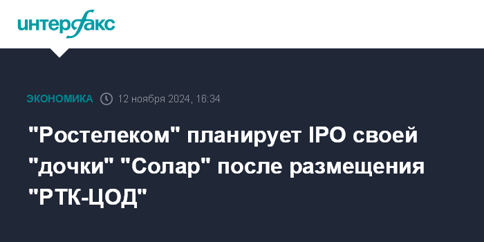 Москва. 12 ноября. INTERFAX.RU - ПАО "Ростелеком" планирует провести IPO своей "дочки" ГК "Солар" (работает в сфере информационной безопасности) после выхода на биржу "РТК-ЦОД", сообщил президент "Ростелекома" Михаил Осеевский на онлайн-конференции для инвесторов.