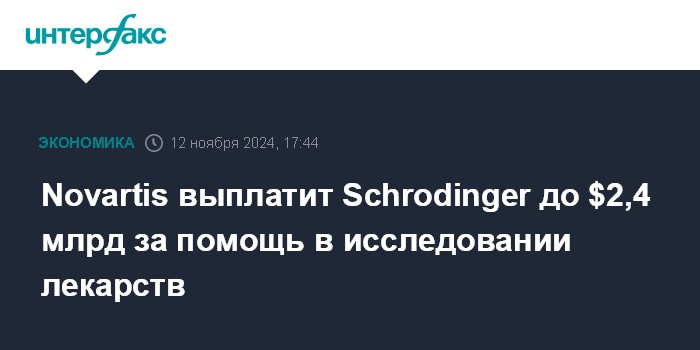 Москва. 12 ноября. INTERFAX.RU - Американская Schrodinger Inc., работающая в сферах научного программного обеспечения (ПО) и биотехнологий, получит от швейцарской Novartis до $2,4 млрд в рамках нового многолетнего соглашения о научном сотрудничестве и лицензировании, говорится в пресс-релизе Schrodinger.