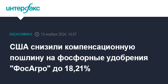 Москва. 13 ноября. INTERFAX.RU - Министерство торговли США в результате административного пересмотра снизило ставку компенсационной пошлины на импорт фосфорных удобрений "ФосАгро" до 18,21%, говорится в материалах ведомства.