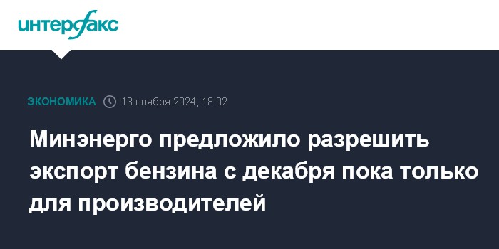 Источники "Интерфакса", знакомые с ситуацией, сообщили, что предлагается снять запрет на экспорт бензина всех видов с 1 декабря и только для производителей. По данным одного из источников, в то же время для всех других экспортеров запрет предлагается продлить еще на два зимних месяца.