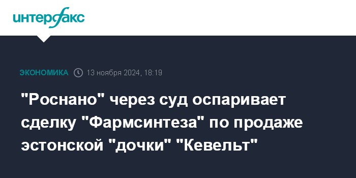 "Со стороны "Фармсинтез" была совершена сделка по продаже 100% акций дочернего акционерного общества Kevelt без получения необходимого одобрения совета директоров общества. В связи с чем АО "Роснано" обратилось в суд с иском о признании данной сделки недействительной", - сообщили "Интерфаксу" в пресс-службе "Роснано", которая является владельцем 25% "Фармсинтеза".