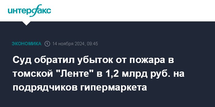 Москва. 14 ноября. INTERFAX.RU - Арбитражный суд Москвы частично удовлетворил иск "Ингосстраха" к компаниям-подрядчикам томского гипермаркета "Лента" о взыскании с них 1,236 млрд рублей убытков после пожара в гипермаркете в 2021 году в Томске.