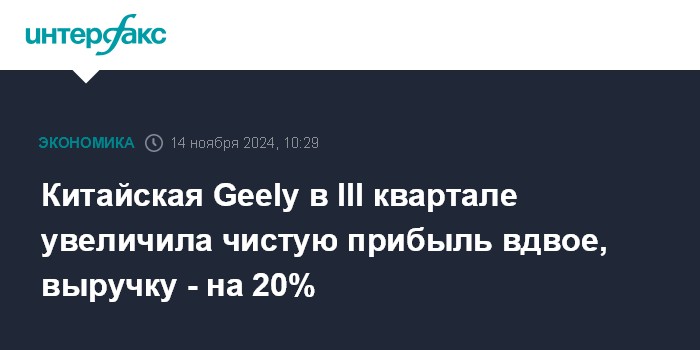 Москва. 14 ноября. INTERFAX.RU - Один из крупнейших китайских автопроизводителей Geely Automobile Holdings Ltd в третьем квартале увеличил чистую прибыль почти в два раза, в том числе благодаря спросу на электрокары.