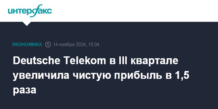 Москва. 14 ноября. INTERFAX.RU - Deutsche Telekom AG, крупнейшая телекоммуникационная компания Европы, в третьем квартале текущего года увеличила чистую прибыль в 1,5 раза, при этом выручка немного превзошла ожидания рынка.