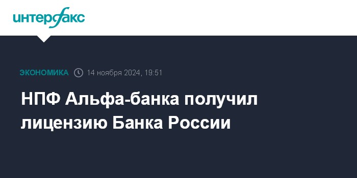 Москва. 14 ноября. INTERFAX.RU - Банк России выдал АО "НПФ Альфа" лицензию на осуществление деятельности по пенсионному обеспечению и пенсионному страхованию, говорится в материалах регулятора. При этом НПФ не сможет заниматься обязательным пенсионным страхованием.