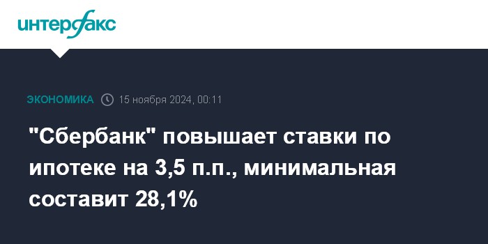 Москва. 15 ноября. INTERFAX.RU - Сбербанк с 15 ноября повышает ставки по базовым ипотечным программам на 3,5 процентных пункта (п.п.) в связи с увеличением ключевой ставки и ростом стоимости ОФЗ, говорится в сообщении кредитной организации.