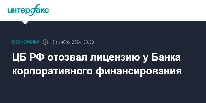 ЦБ РФ отозвал лицензию у Банка корпоративного финансирования