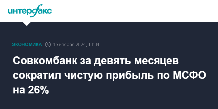 Москва. 15 ноября. INTERFAX.RU - Группа Совкомбанка за 9 месяцев 2024 года сократила чистую прибыль по МСФО на 26% - до 57 млрд руб. по сравнению с 76 млрд руб. прибыли за январь-сентябрь 2023 года, говорится в сообщении кредитной организации.