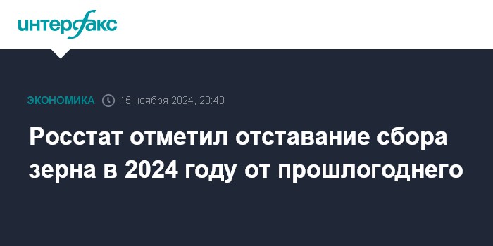 Москва. 15 ноября. INTERFAX.RU - В России сбор зерна на 1 ноября, в хозяйствах всех категорий составлял 124,3 млн тонн (в бункерном весе), сообщил Росстат. Это на 16,7 млн тонн меньше, чем на 1 ноября 2023 года (141 млн тонн).