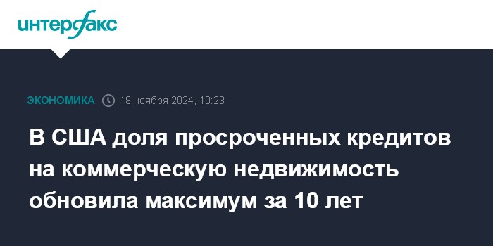 Москва. 18 ноября. INTERFAX.RU - Доля просроченных кредитов на коммерческую недвижимость в США во втором квартале превысила 1% и вышла на максимум с 2014 года, отмечается в очередном полугодовом отчете Федеральной резервной системы о надзоре и регулировании (Supervision and Regulation Report).