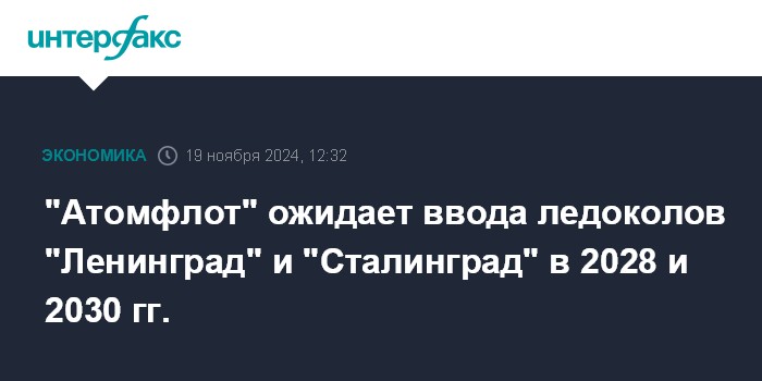 Москва. 19 ноября. INTERFAX.RU - Ввод атомных ледоколов "Ленинград" и "Сталинград", пятого и шестого серийных ледоколов проекта 22220, ожидается в 2028 и 2030 годах соответственно. Об этом говорится в презентации генерального директора ФГУП "Атомфлот" Якова Антонова к конференции "Логистика в Арктике: освоение арктического шельфа" в Мурманске во вторник.