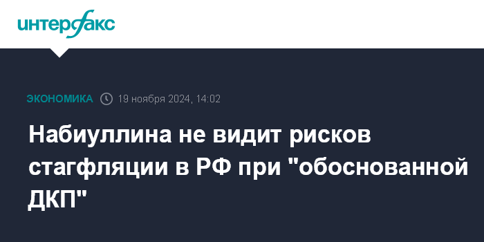 Москва. 19 ноября. INTERFAX.RU - Стагфляцию в экономике обычно вызывает мягкая денежно-кредитная политика, в России рисков возникновения стагфляции нет при проведении обоснованной ДКП, заявила председатель Банка России Эльвира Набиуллина в ходе выступления в Госдуме во вторник.