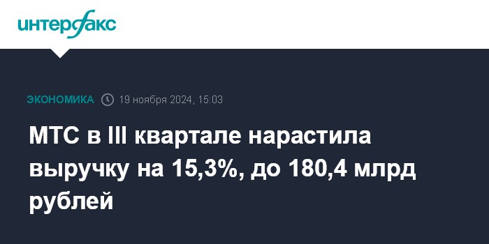 Москва. 19 ноября. INTERFAX.RU - ПАО "МТС" в III квартале 2024 года увеличило выручку на 15,3% год к году - до 180,4 млрд рублей, сообщила компания.