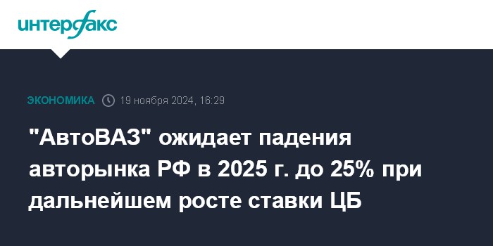 Москва. 19 ноября. INTERFAX.RU - Рынок легковых и легких коммерческих автомобилей в РФ, который по итогам 2024 года достигнет отметки в 1,7 млн штук, в 2025 году при условии дальнейшего роста ключевой ставки ЦБ может упасть примерно на четверть, ожидают в "АвтоВАЗе".