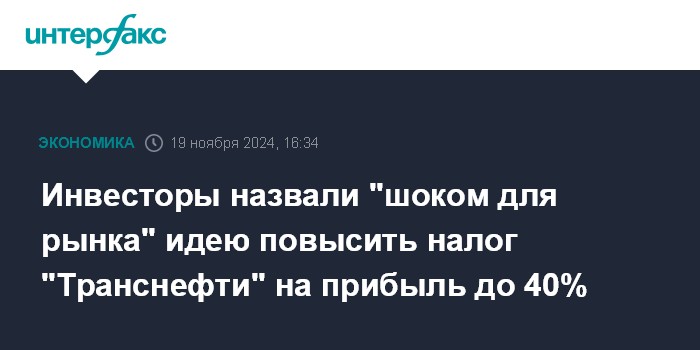 18 ноября источник "Интерфакса" сообщил, что Минфин предложил правительству изменить налогообложение нефтегазовой отрасли, в том числе повысить ставку налога на прибыль для субъектов естественной монополии, осуществляющих транспортировку нефти и нефтепродуктов по системе магистральных трубопроводов (то есть "Транснефти"), до 40% в налоговых периодах 2025-2030 годов. Сейчас налог на прибыль "Транснефти" рассчитывается по общеустановленной ставке 20%. С 1 января 2025 года она должна вырасти до 25%, как и для всех российских организаций.