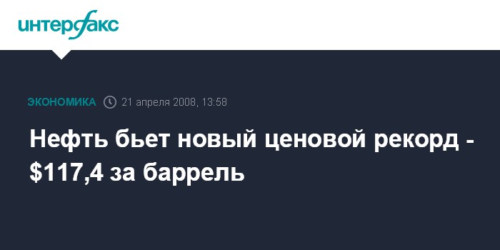 Лондон. 21 апреля. ИНТЕРФАКС-АНИ - Нефть бьет новый ценовой рекорд - $117,4 за баррель - после заявления представителя ОПЕК, что картель не намерен увеличивать нефтедобычу, сообщило агентство Bloomberg.