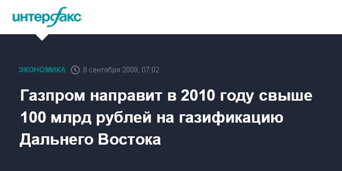 Хабаровск. 8 сентября. ИНТЕРФАКС - ДАЛЬНИЙ ВОСТОК - ОАО "Газпром" намерено направить в 2010 г. свыше 100 млрд рублей в рамках реализации Восточной газовой программы, сообщил заместитель председателя правления концерна Александр Ананенков.