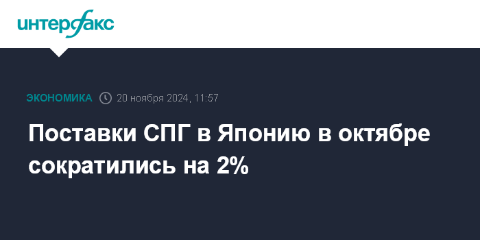Москва. 20 ноября. INTERFAX.RU - Япония, второй в мире покупатель сжиженного природного газа, в октябре 2024 года импортировала 5,292 млн тонн СПГ, что на 2% (примерно на два крупнотоннажных танкера) меньше, чем в том же месяце 2023 года, сообщило министерство финансов. Такая осторожная динамика была характерна и для сентябрьских закупок (-2%), и для августовских (+1%).