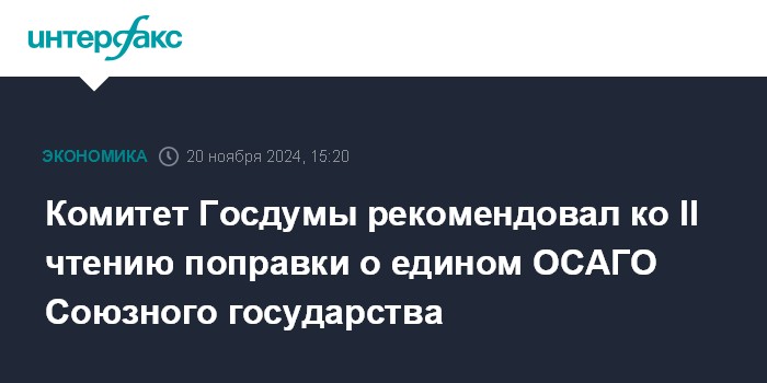 Москва. 20 ноября. INTERFAX.RU - Комитет Госдумы по финансовому рынку рекомендовал принять во II чтении поправки к закону об ОСАГО о расширении действия российского полиса ОСАГО на территорию Белоруссии, о создании единой системы обязательного страхования гражданской ответственности владельцев транспортных средств в рамках Союзного государства.