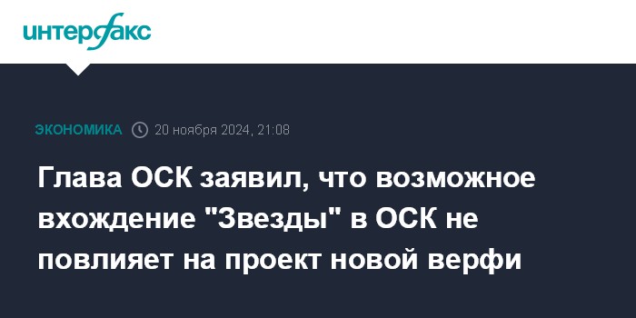 Глава ОСК заявил, что возможное вхождение "Звезды" в ОСК не повлияет на проект новой верфи