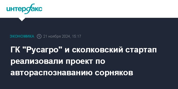 Москва. 21 ноября. INTERFAX.RU - ГК "Русагро" и резидент "Сколково" - стартап "АссистАгро" завершили проект по внедрению системы автоматического распознавания сорняков с использованием беспилотников, сообщается в пресс-релизе "Сколково".