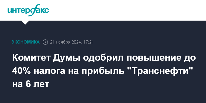Москва. 21 ноября. INTERFAX.RU - Комитет Госдумы по бюджету на заседании в четверг проголосовал за принятие во втором чтении поправки об увеличении ставки налога на прибыль для субъектов естественной монополии, осуществляющих транспортировку нефти и нефтепродуктов по системе магистральных трубопроводов (то есть "Транснефти"), до 40% в налоговых периодах 2025-2030 годов.